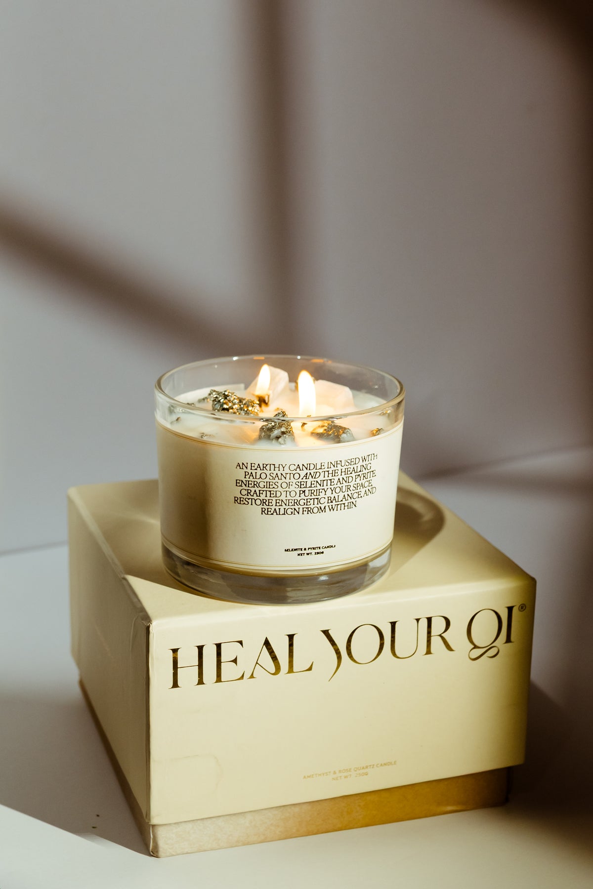 An earthy, grounding candle infused with the purifying scent of Palo Santo and the healing vibrations of Selenite and Pyrite crystals. Designed to cleanse stagnant energy, restore balance, and realign your inner strength, it transforms any space into a sanctuary of clarity and renewal.