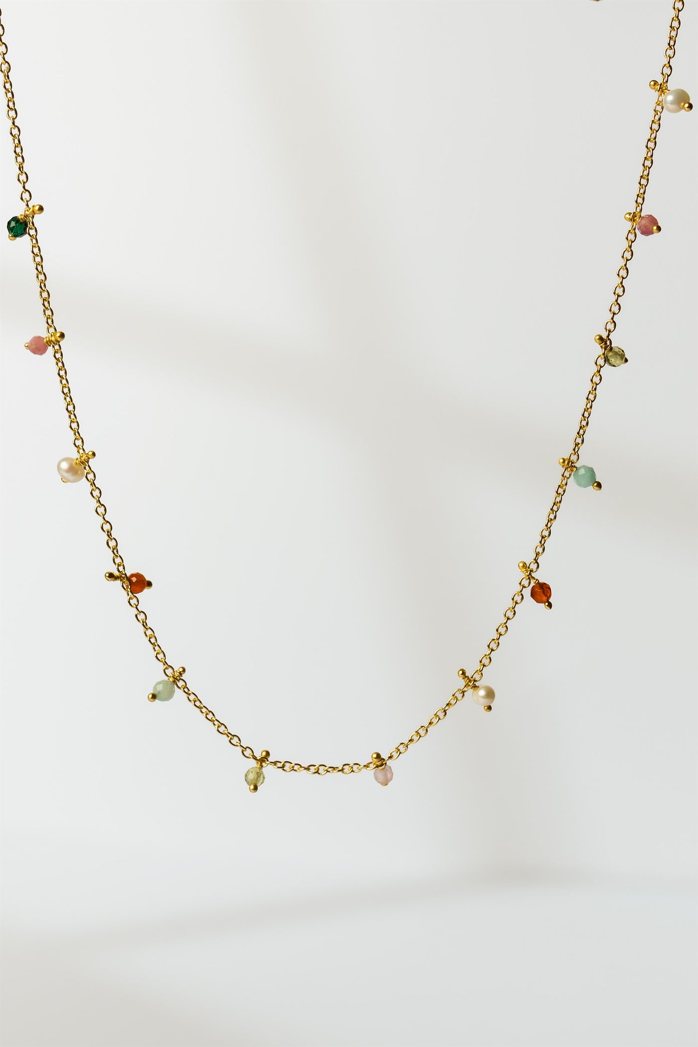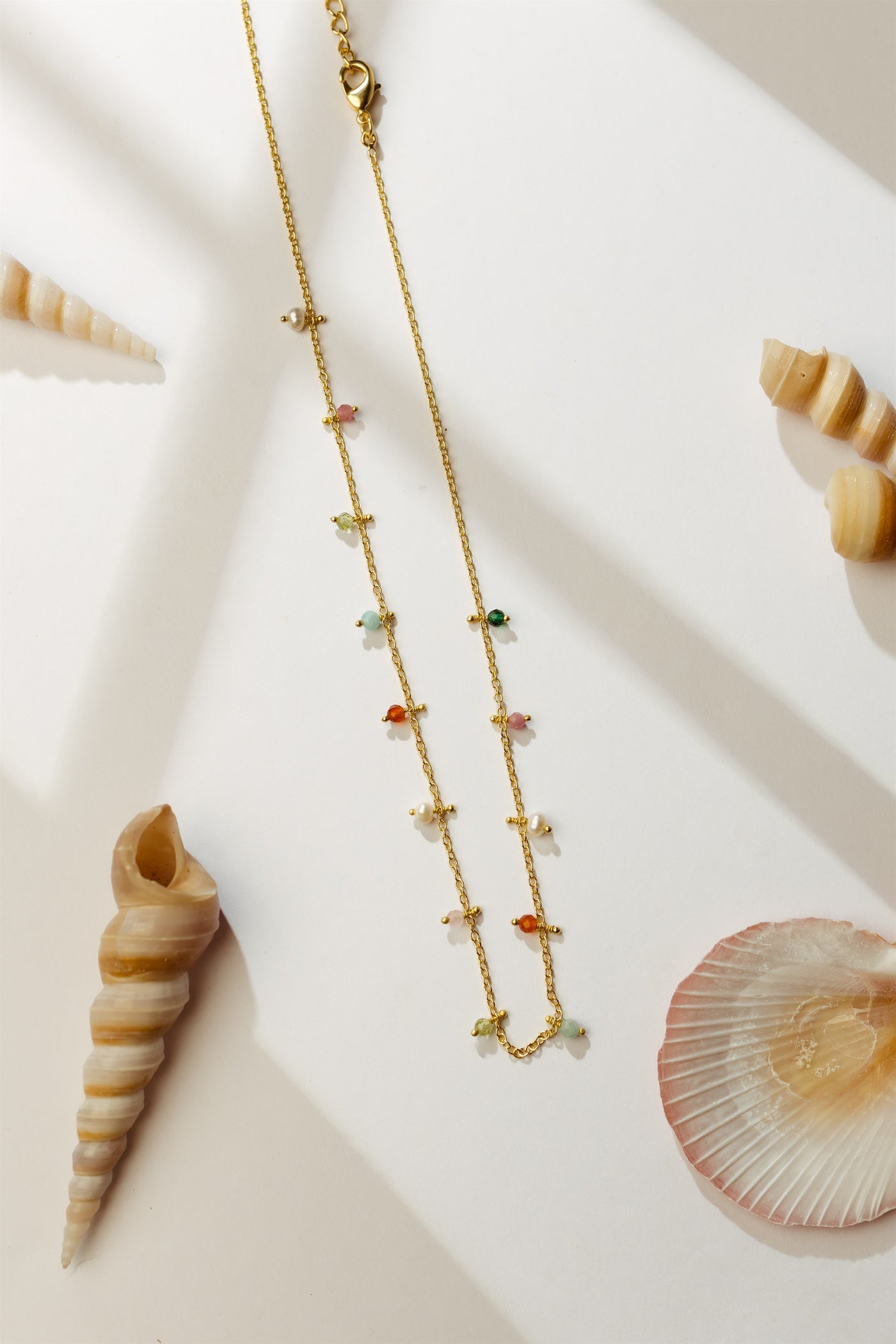 This handcrafted piece is designed in brass with a 1-micron gold plating, featuring delicate 3mm beads of Pearl, Carnelian, Pink Tourmaline, Amazonite, Peridot, Green Tourmaline, and Rose Onyx. Each stone carries its unique vibration, creating harmony between mind, body, and spirit.