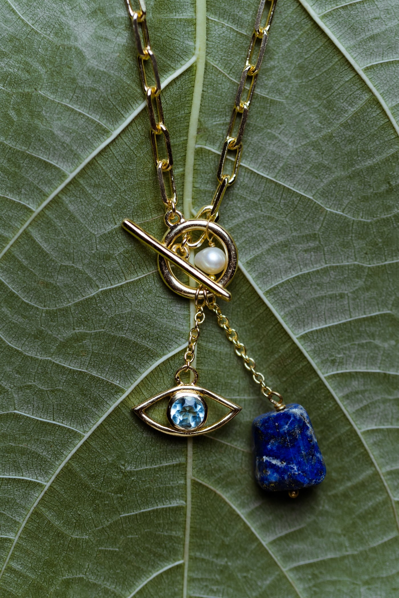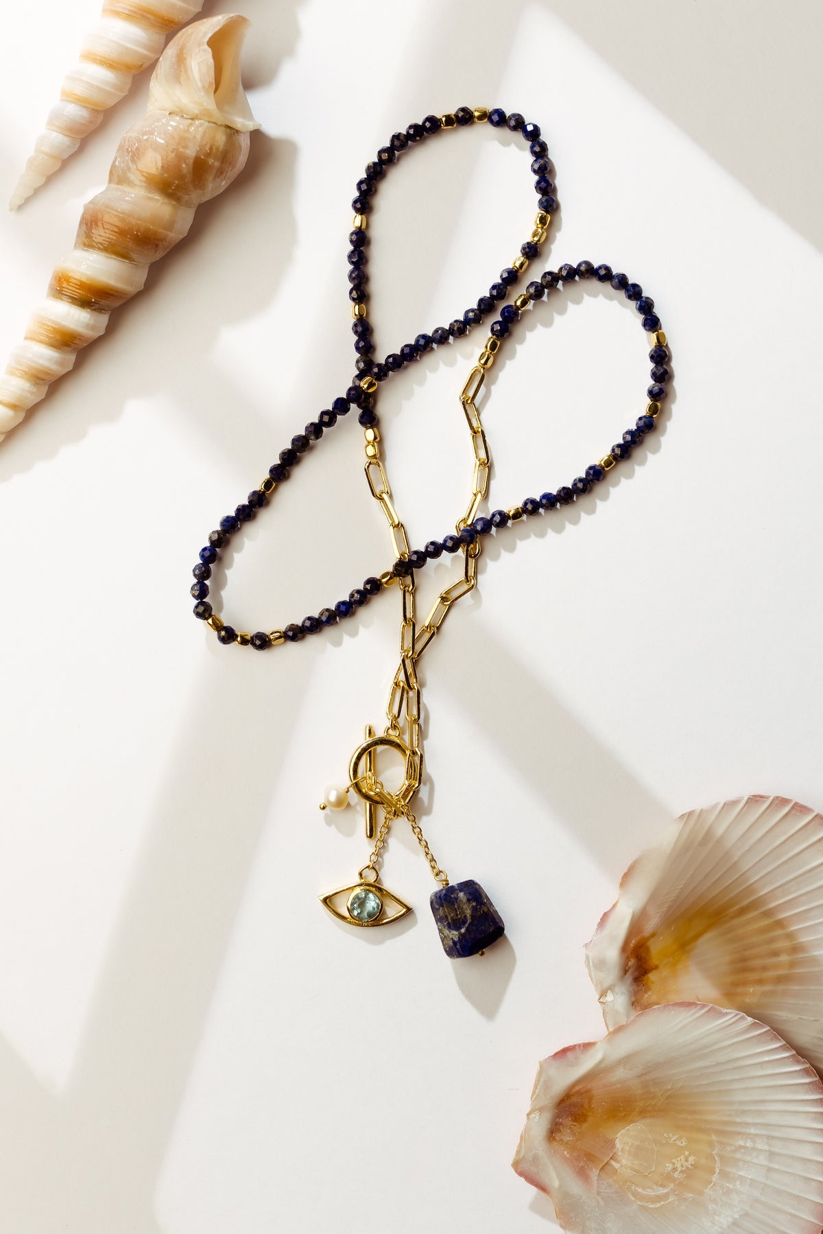 Elevate your spiritual shield with the Lapis Lazuli Evil Eye Necklace, meticulously handcrafted with deep blue lapis lazuli beads and a radiant evil eye charm. Lapis lazuli, known as the “Stone of Wisdom,” encourages intuition, truth, and emotional balance, while the evil eye symbol acts as a timeless talisman against negativity and misfortune. This necklace combines ancient energies for holistic protection and empowered self-expression.