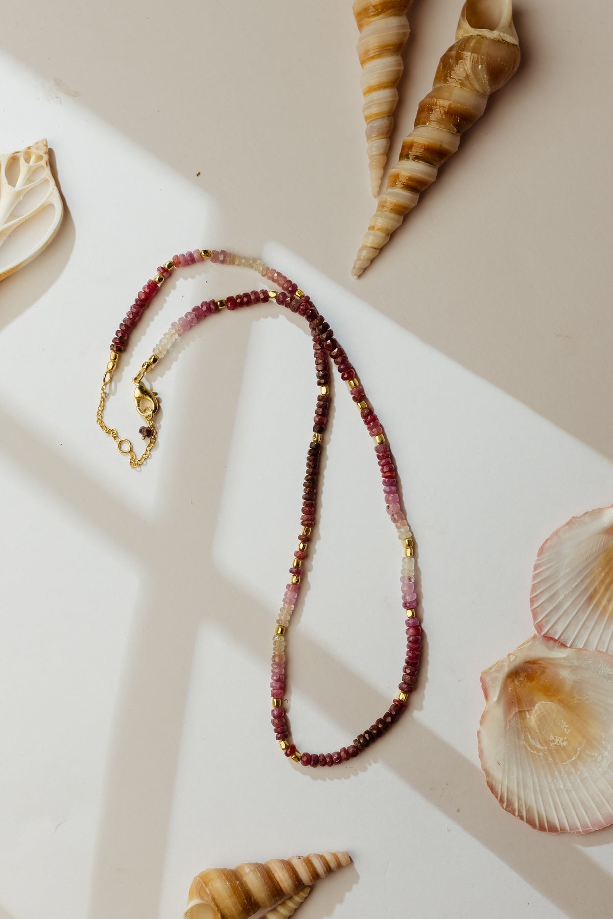 A vibrant celebration of color and energy, the Ruby Beaded Necklace artfully blends naturally shaded ruby beads, ranging from the softest pink to the deepest crimson red. Each hand-strung bead captures a unique hue along the ruby spectrum, creating a luminous ombré effect that enhances the necklace’s elegance and depth. Finished with subtle golden accents, this piece invites both luxurious style and powerful healing into your daily ritual.